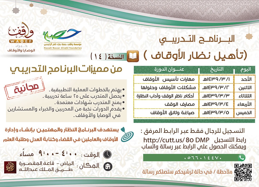 في دورته الرابعة عشر على مستوى المملكة العربية السعودية يبدأ إن شاء الله تعالى الأحد  غرّة شهر ربيع الأول لعام  1439هـ الموافق 2017/11/20م البرنامج التدريبي (تأهيل نظار الأوقاف)  والذي يقدمه مركز واقف هذه المرة برعاية كريمة من مؤسسة وقف حصة بنت ناصر الراجحي.