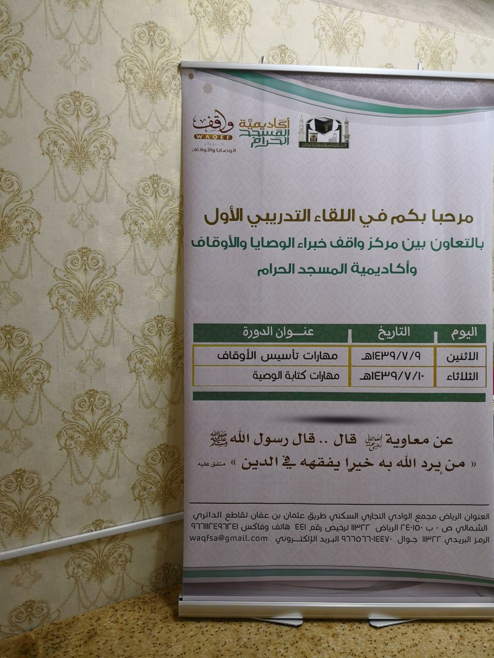 بفضل الله تعالى انطلق قبل قليل اللقاء التدريبي الأول بالتعاون بين مركز واقف خبراء الوصايا والأوقاف وأكاديمية المسجد الحرام بمكة المكرمة، والذي ينعقد ليومين تدريبين بالقاعة التدريبية رقم 1 بالأكاديمية، ويتناول اللقاء الأول مهارات تأسيس الأوقاف للمدرب الشيخ سليمان بن جاسر الجاسر رئيس مجلس الإدارة المشرف العام على المركز