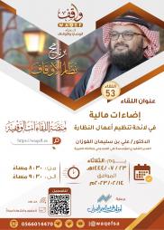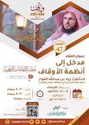 * مهارات المستشار الوقفي النسخة 05 * اللقاء الوقفي 53 | إضاءات مالية في لائحة تنظيم أعمال النظارة | * اللقائين الوقفي 50 - 51 | المعيار الشرعي للوقف | * اللقاء الوقفي 49 | أحكام الناظر الفقهية | * اللقاء الوقفي 47 | مدخل إلى أنظمة الأوقاف | * إطلاق منصة اللقاءات الوقفية * اللقاء 46 || مقاصد الوقف الذري وسبل إصلاحه || أ.د. سليمان بن محمد النجران * اللقاء 45 || الضوابط الشرعية لاستثمار الأوقاف || أ.د.فهد بن عبدالرحمن اليحيى * اللقاء 44 |" الوصية الشعيرة المنسية "|الشيخ سليمان بن جاسر الجاسر * اللقاء 43 | الوقف حياة لا تنتهي| الشيخ وليد الدهوان
