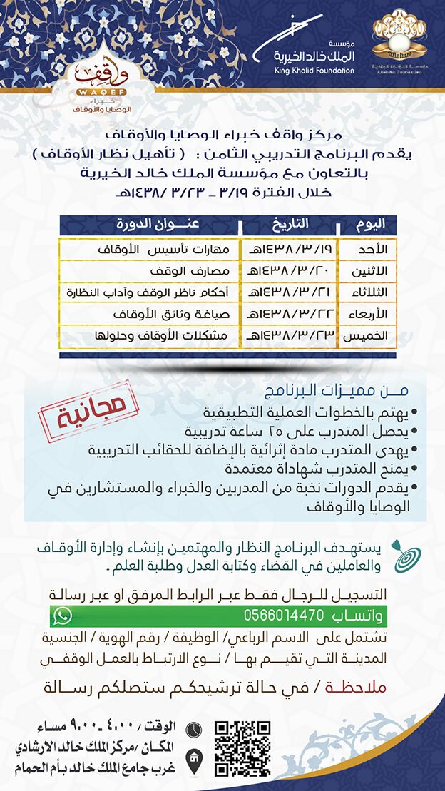 في دورته الثامنة على مستوى المملكة العربية السعودية ينتهي غدا الخميس 23/31438هـ الموافق 22/12/2016 برنامج تأهيل نظار الأوقاف  والذي يقدمه مركز واقف هذه المرة برعاية كريمة من مؤسسة اللؤلؤة الوقفية وبشراكة مع مؤسسة الملك خالد الخيرية ممثلة في مركز الملك خالد الإرشادي بالرياض والذي بدأ الأحد الماضي بمركز الملك خالد الإرشادي غرب جامع الملك خالد بأم الحمام .