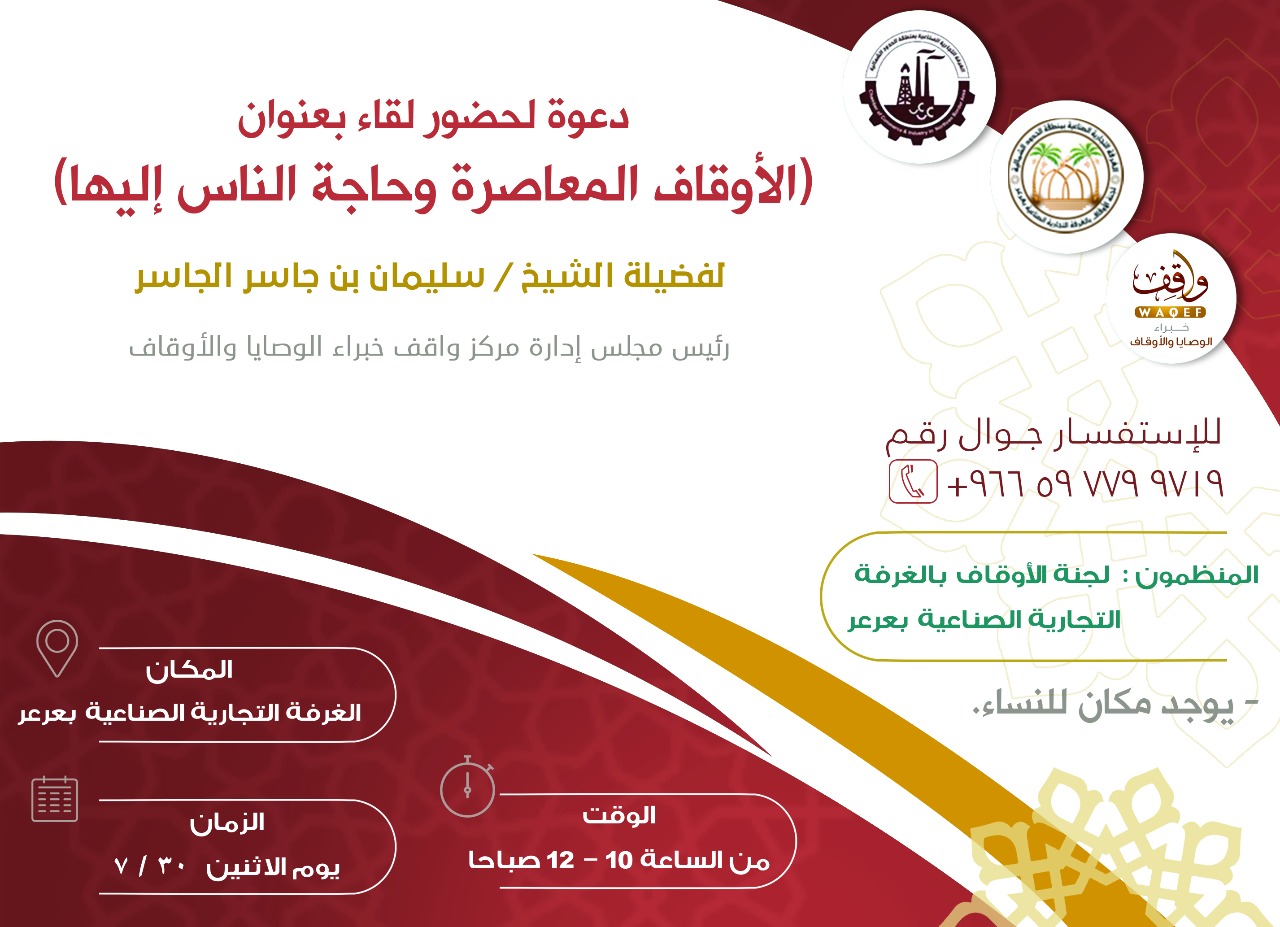 على هامش  البرنامج التدريبي تأهيل نظار الأوقاف والذي سيقام بمشيئة الله تعالى الأحد القادم  بالتعاون مع لجنة الأوقاف بالغرفة التجارية الصناعية بعرعر سيقام لقاءً بعنوان الأوقاف المعاصرة وحاجة الناس إليها وذلك يوم الاثنين 30/7 بمقر الغرفة التجارية الصناعية بعرعر في تمام الساعة العاشرة صباحاً، يأتي هذا اللقاء ضمن جهود مركز واقف في نشر ثقافة الوقف في المجتمع.