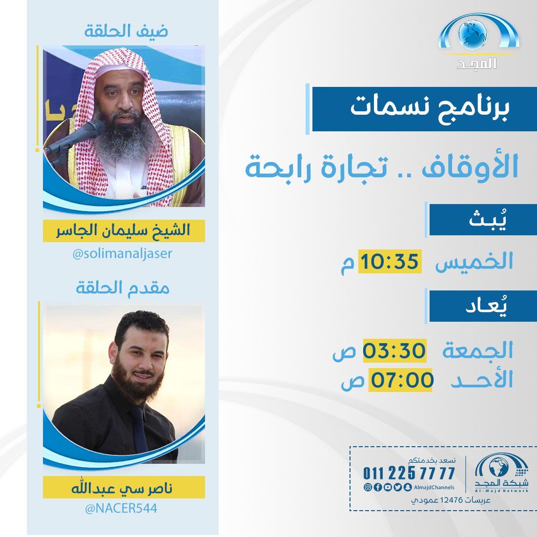 اليوم بمشيئة الله تعالى على قناة المجد العامة وفي تمام الساعة العاشرة والنصف وخمس دقائق مساءً بتوقيت مكة المكرمة موعدكم مع  برنامج نسمات وحلقة بعنوان : الأوقاف تجارة رابحة ، ضيف الحلقة فضيلة الشيخ سليمان بن جاسر الجاسر رئيس مجلس إدارة مركز واقف المشرف العام على المركز.