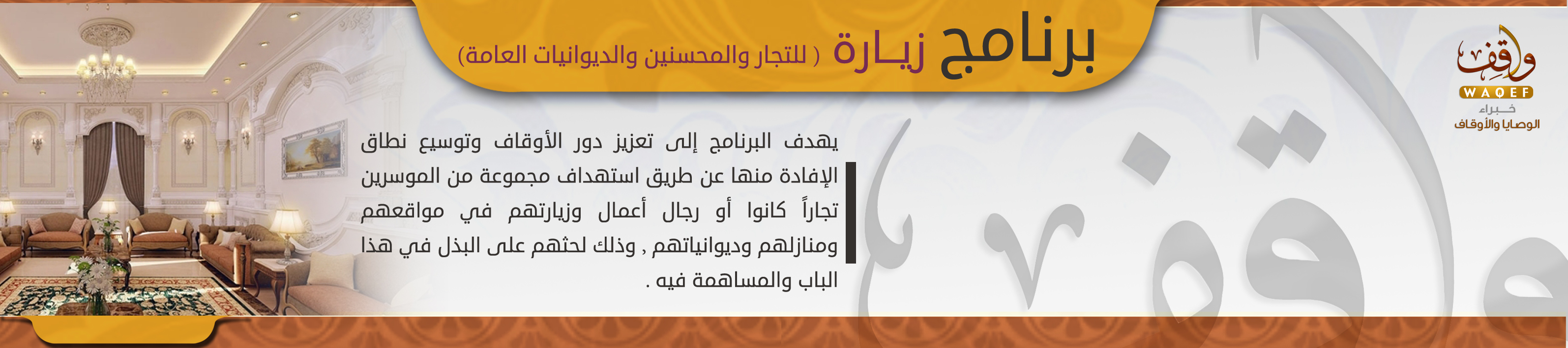 يهدف البرنامج إلى : تعزيز دور الأوقاف ،وتوسيع نطاق الإفادة منها ،عن طريق استهداف مجموعة من الموسرين تجاراً كانوا أو رجال أعمال وزيارتهم في مواقعهم ومنازلهم وديوانياتهم ، وذلك لحثهم على البذل في هذا الباب والمساهمة فيه .